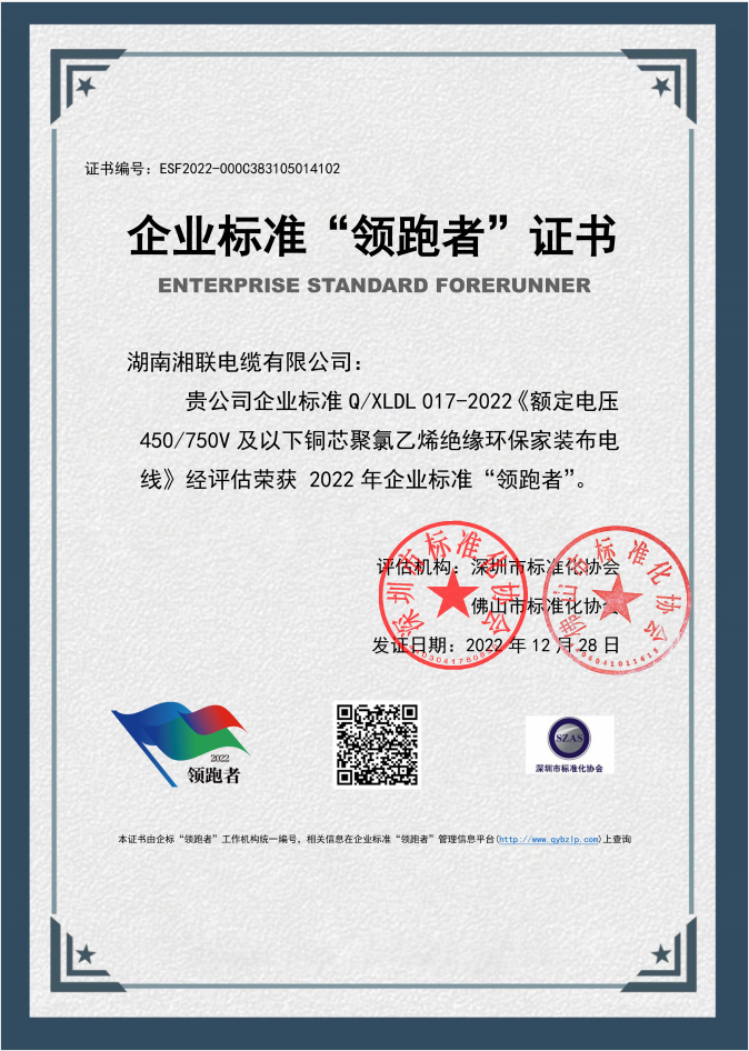 近日,湖南湘聯(lián)電纜有限公司企業(yè)標(biāo)準(zhǔn)Q/XLDL 010-2022《額定電壓 6kV(Um=7.2kV)到 35kV(Um=40.5kV)擠包石墨烯內(nèi)外屏蔽交聯(lián)聚乙烯絕緣電力電纜》、Q/XLDL 016-2022《額定電壓 1kV(Um =1.2 kV)擠包絕緣電力電纜》、Q/XLDL 017-2022《額定電壓450/750V及以下銅芯聚氯乙烯絕緣環(huán)保家裝布電線》三項(xiàng)產(chǎn)品經(jīng)評(píng)定機(jī)構(gòu)評(píng)估,榮獲2022年全國(guó)企業(yè)標(biāo)準(zhǔn)“領(lǐng)跑者”。