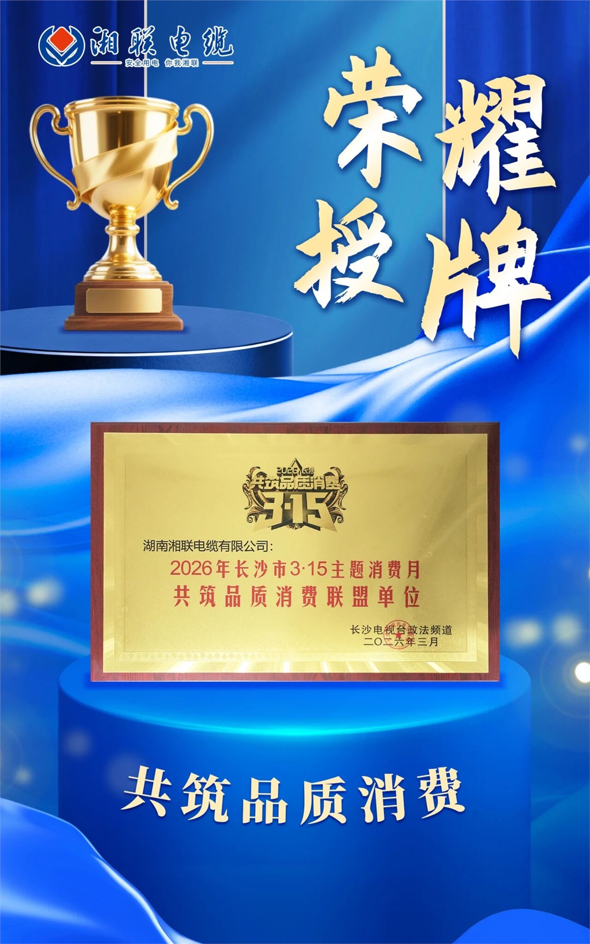 3月21日上午,星城長沙春意盎然,以 “新消費·新勢能·提升消費品質” 為主題的2026年長沙市3·15主題消費月活動啟動儀式在招商花園城隆重舉行。湖南湘聯(lián)電纜有限公司作為重點企業(yè)代表受邀出席,與眾多行業(yè)標桿企業(yè)一同,為營造放心消費環(huán)境、提升消費品質貢獻力量。